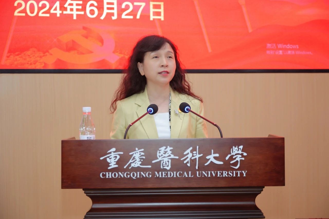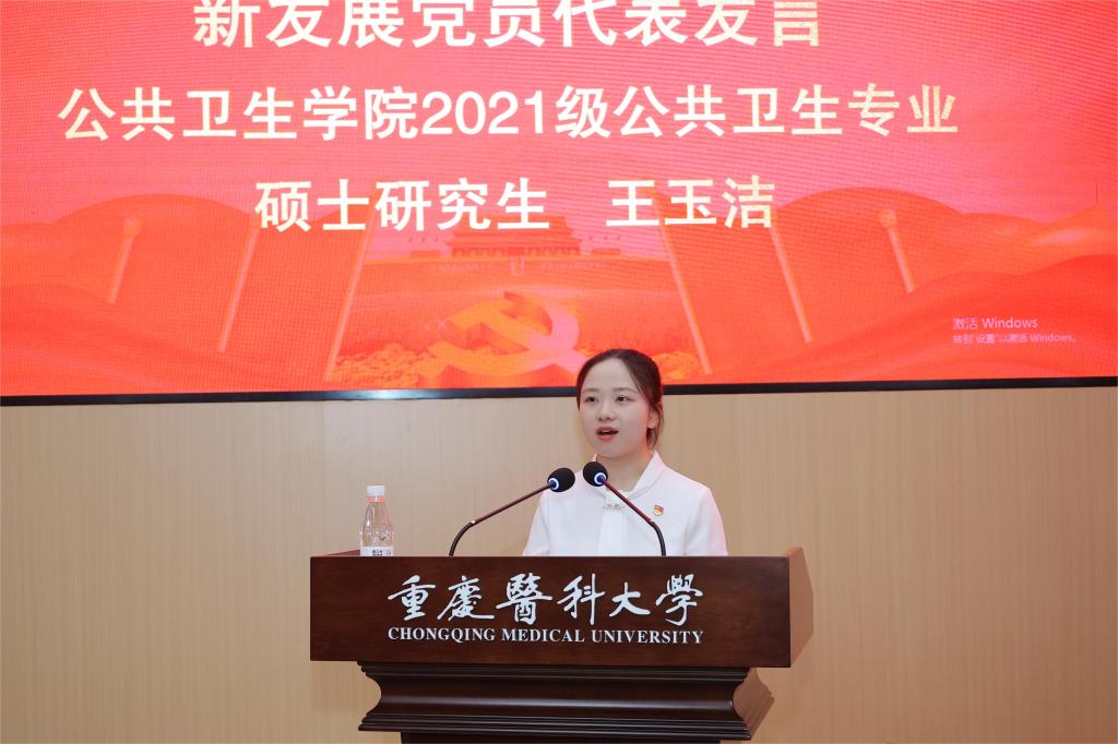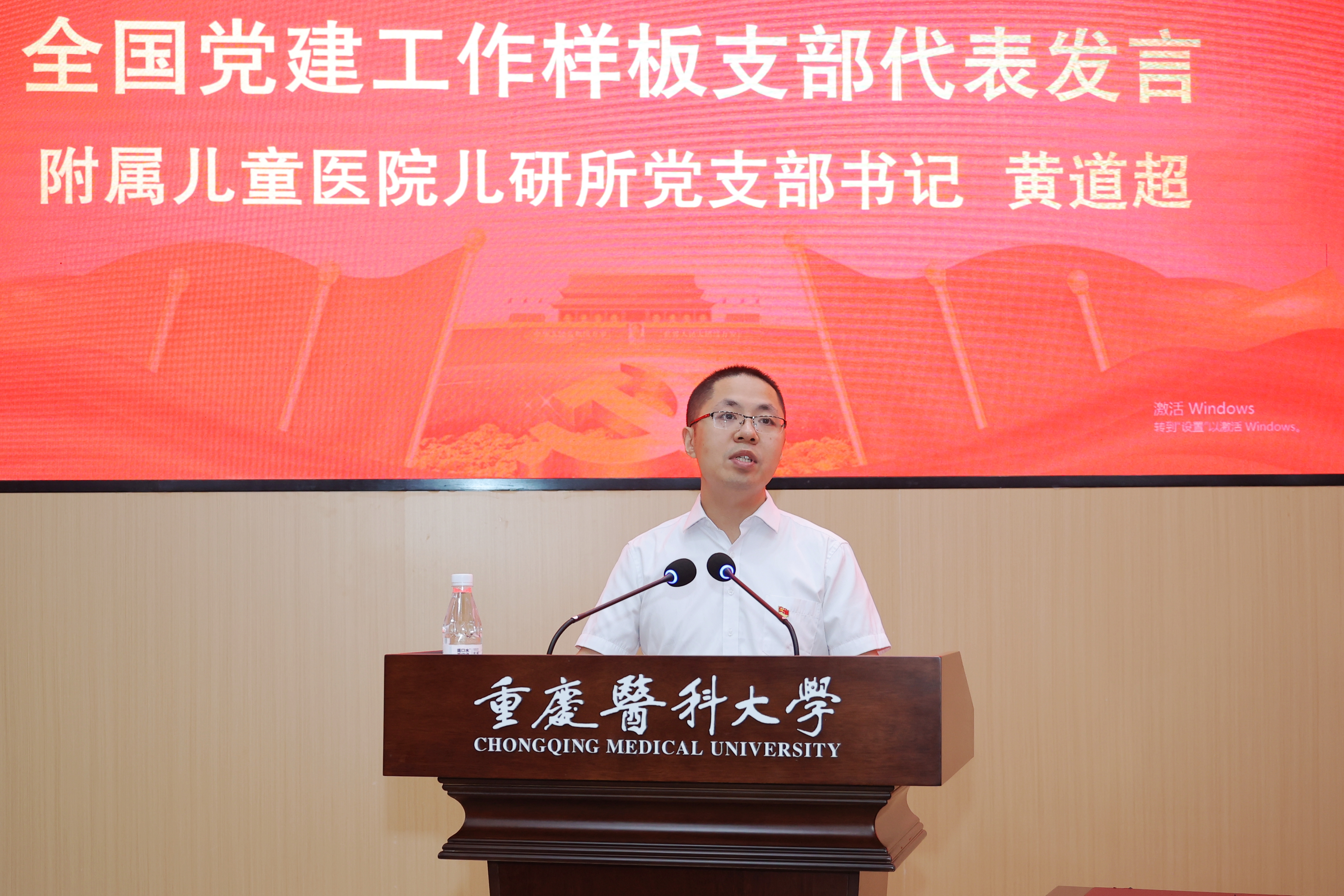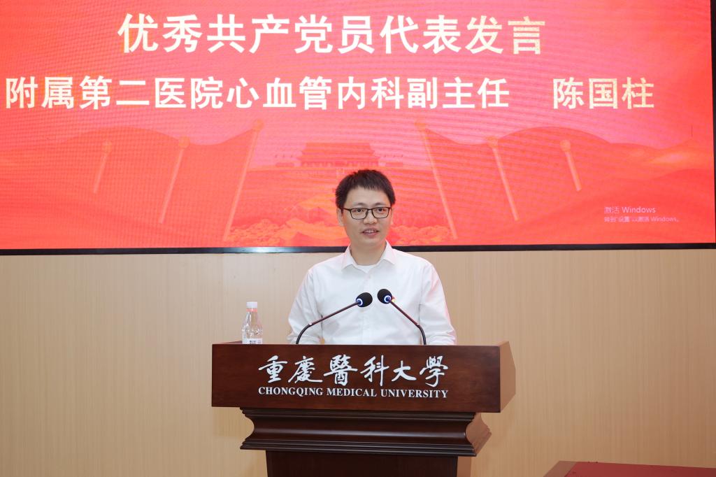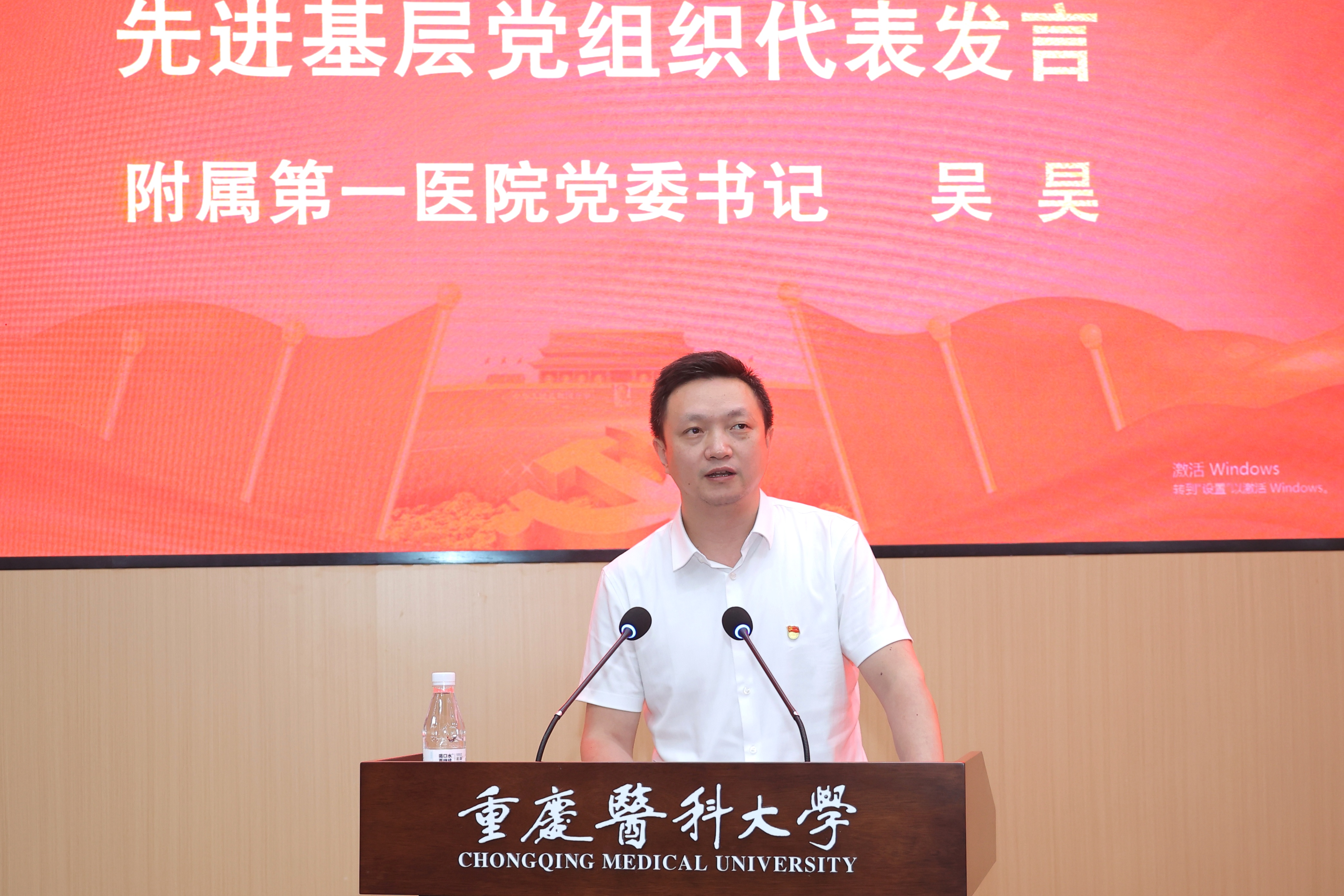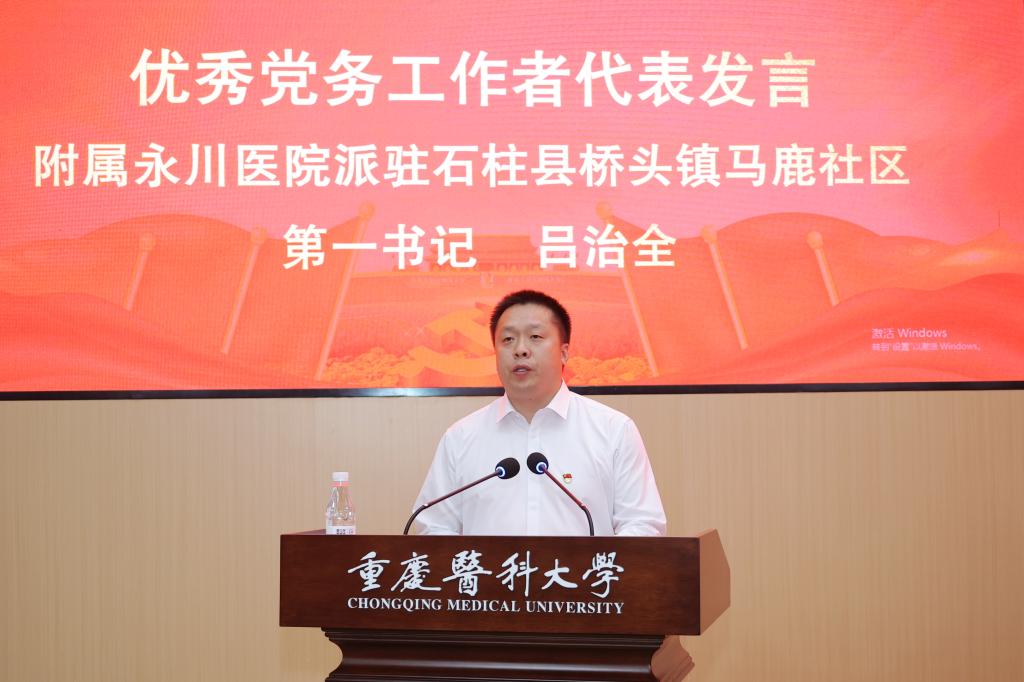 全国高校党建工作样板支部代表、附属儿童医院儿研所党支部书记黄道超,优秀共产党员代表、附属第二医院心血管内科副主任陈国柱,优秀党务工作者代表、附属永川医院派驻石柱县桥头镇马鹿社区第一书记吕治全,新党员代表、公共卫生学院2021级公共卫生专业硕士研究生王玉洁,先进基层党组织代表、附属第一医院党委书记吴昊分别上台发言,分享党建工作的做法成效与经验感悟。