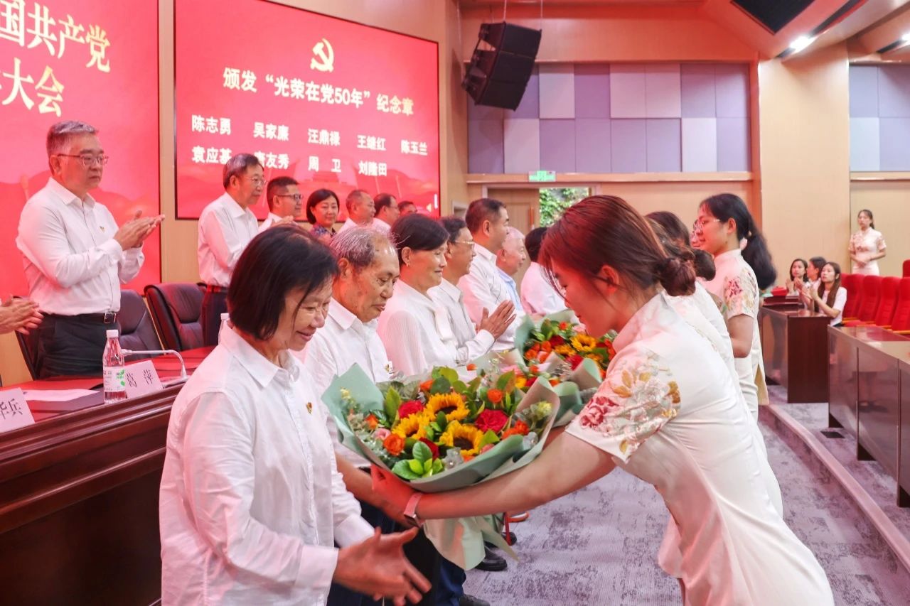 校党委副书记冯跃林主持大会。出席大会的领导向安博平台及各附属医院党龄达50年的老党员颁发“光荣在党50年”纪念章。陈志勇、吴家廉、汪鼎禄、王继红、陈玉兰、袁应基、唐友秀、周卫、刘隆田等9名“光荣在党”50年的老党员代表在现场获颁纪念章。