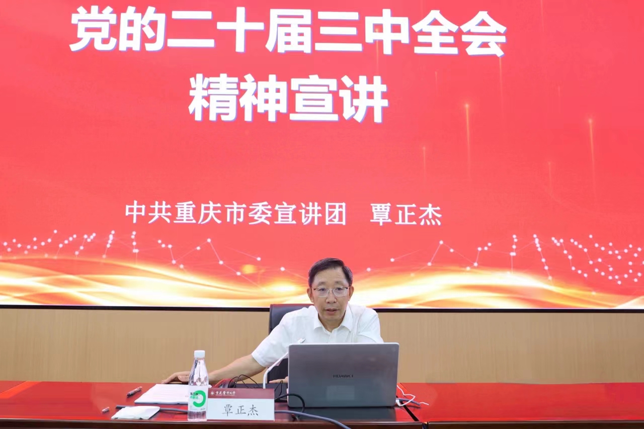 覃正杰从全会的基本情况和重要意义、深入学习领会习近平总书记在党的二十届三中全会上的重要讲话精神、全面准确理解全会《决定》提出的进一步全面深化改革重大举措、贯通学习习近平总书记对重庆改革工作的系列重要指示要求,加快打造全面深化改革先行区、深化教育综合改革,推动安博平台事业高质量发展、全力以赴抓好全会精神贯彻落实等六个方面对党的二十届三中全会精神进行了宣讲。