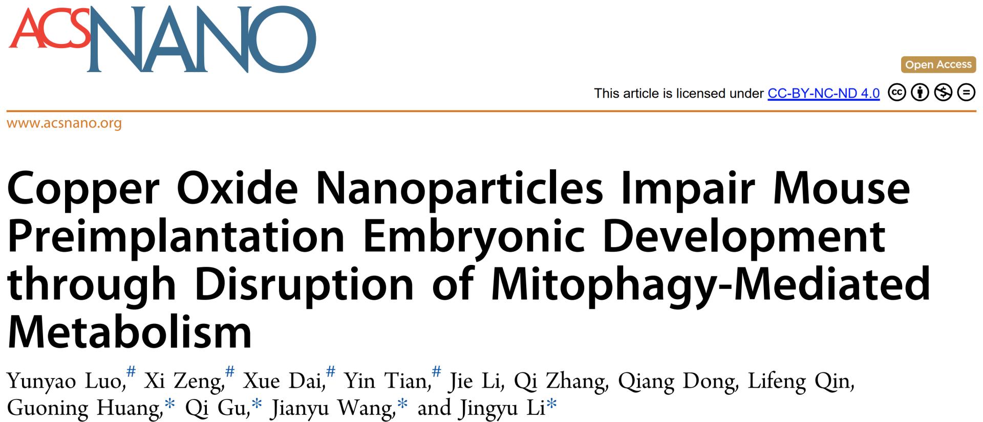 11月2日,我校附属妇女儿童医院生殖医学中心李竞宇/黄国宁、安博平台王健宇以及中国科学院动物研究所顾奇团队合作在ACS Nano期刊上发表了题为Copper oxide nanoparticles impair mouse pre-implantation embryonic development through disruption of mitophagy-mediated metabolism的最新研究成果。该研究揭示CuONPs暴露可通过线粒体-代谢途径,影响DNA去甲基化,从而抑制发育及多能性基因表达诱导植入前胚胎发育毒性。