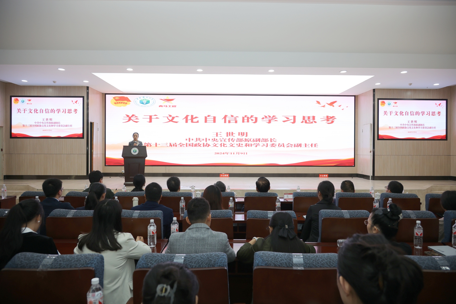 11月9日,中共中央宣传部原副部长王世明来我校为2024年“青年工程”学员作题为《关于文化自信的学习思考》的学术讲座。校党委书记覃正杰,校党委常委、副校长葛萍,党委办公室、党委宣传部、校团委、后勤管理处、马克思主义学院负责人,教师团干部、青马班学员、各学院学生代表等300余师生现场聆听。讲座由葛萍主持。
