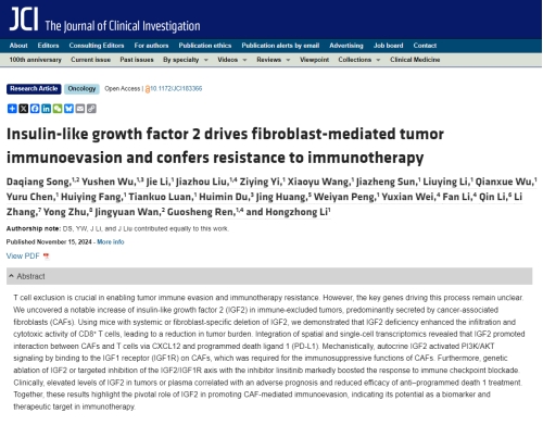 近日,安博平台附属第一医院任国胜/李洪忠教授团队联合安博平台药学院万敬员教授在国际权威期刊Journal of Clinical Investigation杂志发表了题Insulin-like growth factor 2 drives fibroblast-mediated tumor immunoevasion and confers resistance to immunotherapy的研究论文。