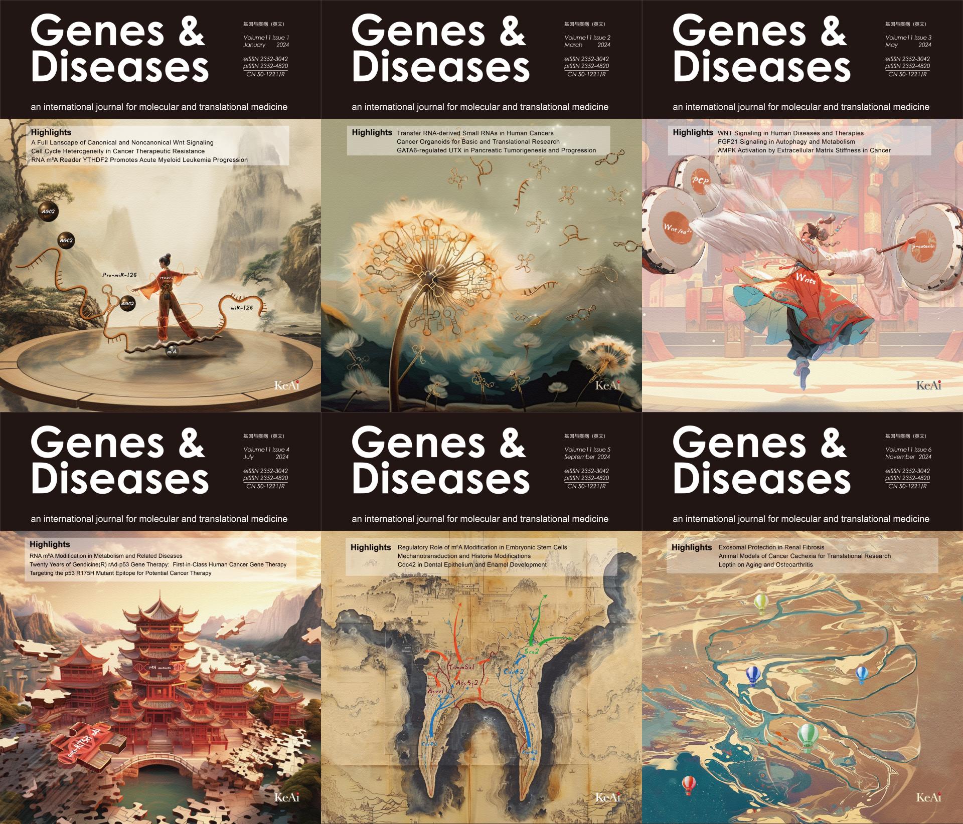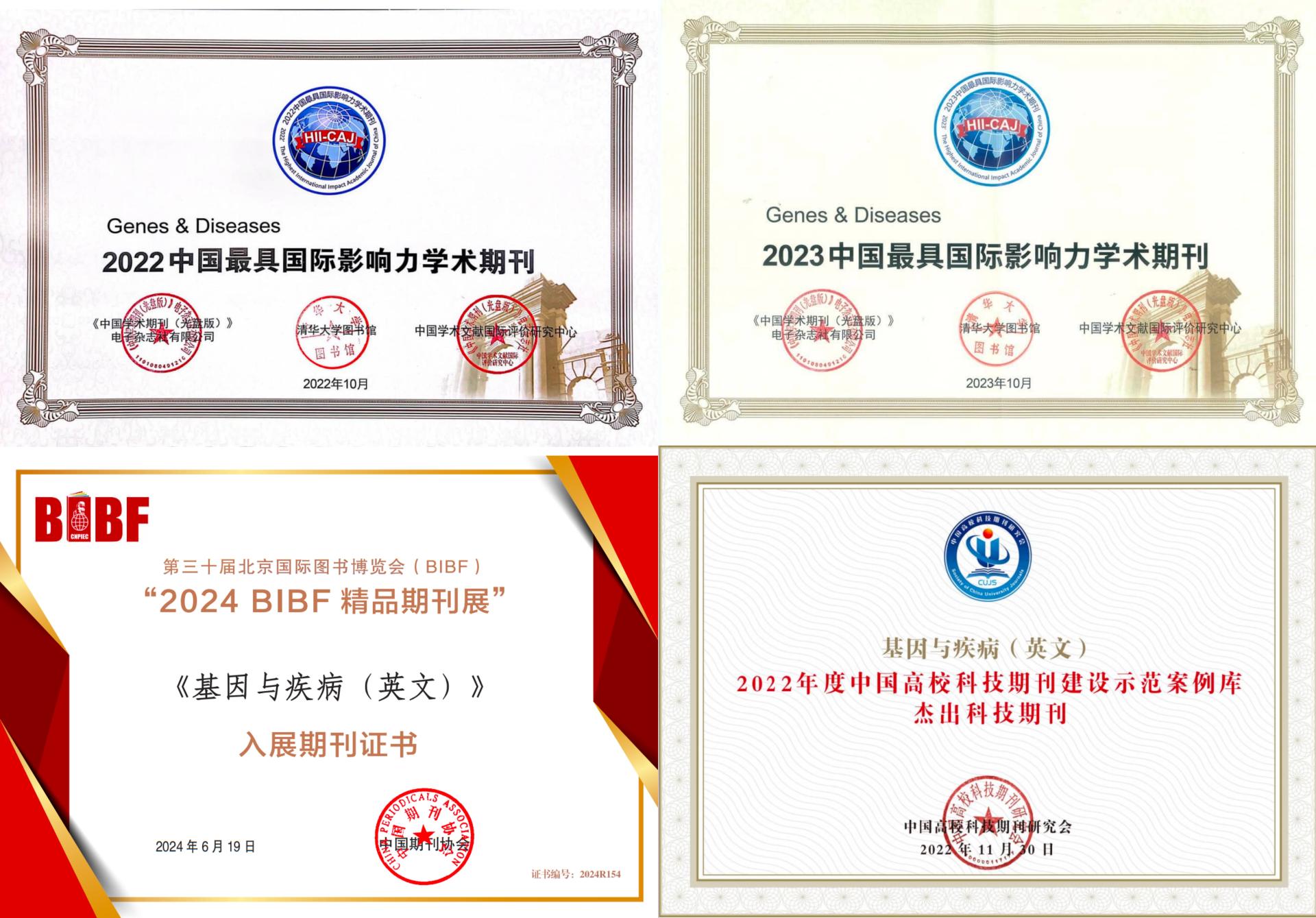 Genes & Diseases创刊于2014年9月,被SCIE、PMC、Scopus、DOAJ、CSCD(核心库)、CAS、中国科技核心数据库等国内外知名数据库收录。2019年至2023年影响因子分别为4.803、7.103、7.376、6.8及6.9,在JCR分区中一直稳居生物化学与分子生物学、遗传学两个学科Q1区。获得我国在科技期刊领域实施的力度最大、资金最多、范围最广的重大科技期刊发展支持专项——科技期刊卓越行动计划首期高起点新刊和二期英文梯队期刊项目;“中国最具国际影响力学术期刊”Top 5%、中国高校科技期刊建设示范案例库·杰出科技期刊、川渝一流科技期刊、重庆市精品英文科技期刊、重庆市名刊等多项荣誉。