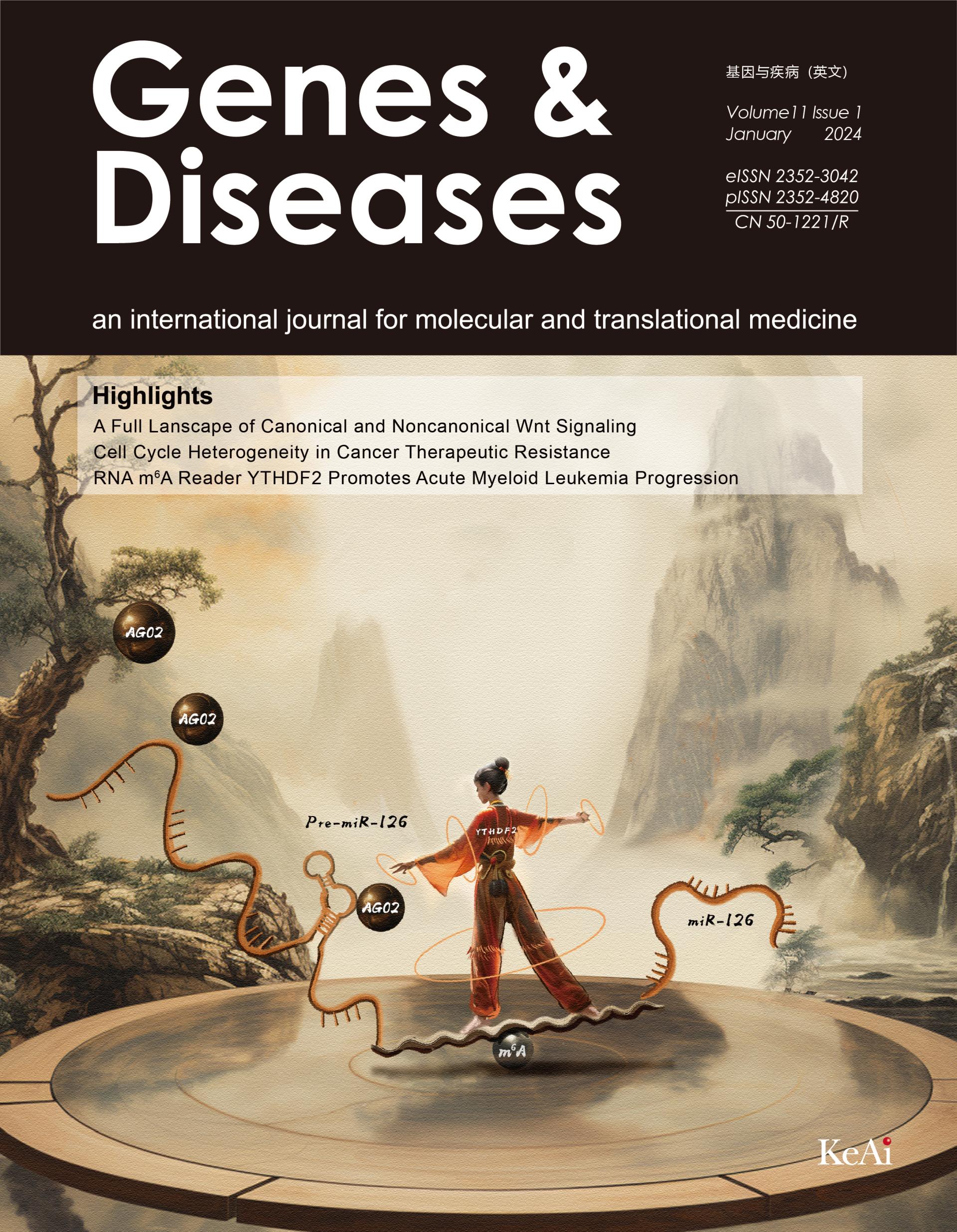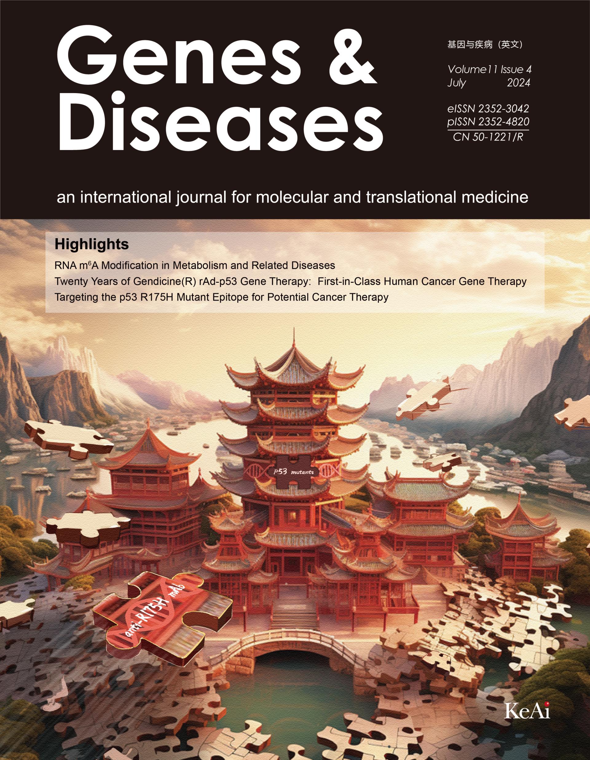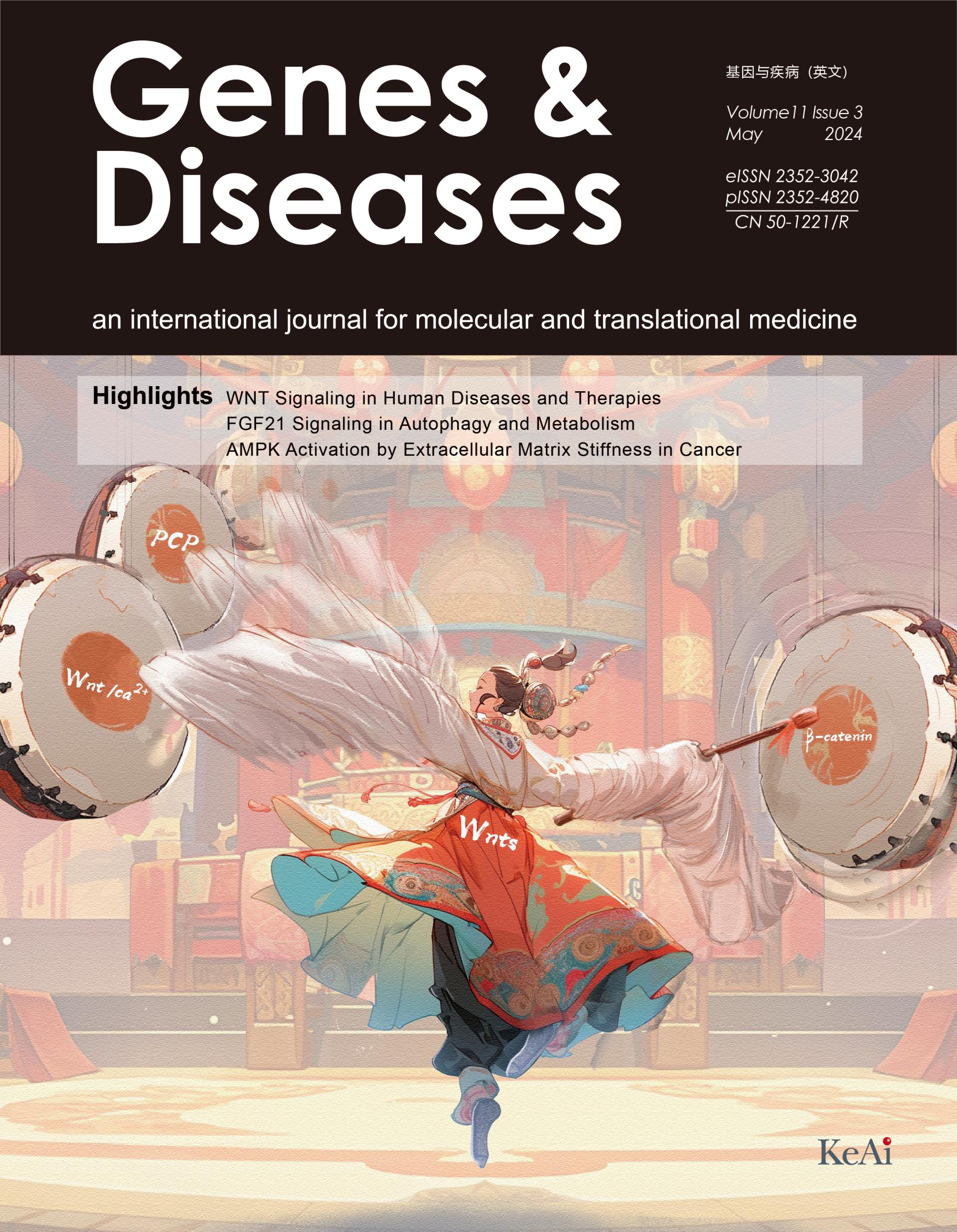 Genes & Diseases创刊于2014年9月,由我校校长黄爱龙教授与芝加哥大学医学中心何通川教授共同担任主编,定位为国际化、高影响力的生物医学综合性科技期刊,目前已被SCIE、PMC、Scopus、DOAJ、CSCD(核心库)、CAS、中国科技核心数据库等国内外知名数据库收录,2021年由季刊变更为双月刊。2019年至2023年影响因子分别为4.803、7.103、7.376、6.8及6.9,在JCR分区中一直稳居生物化学与分子生物学、遗传学两个学科Q1区。获得“中国最具国际影响力学术期刊”Top 5%、中国高校科技期刊建设示范案例库·杰出科技期刊、川渝一流科技期刊、重庆市精品英文科技期刊、重庆市名刊等多项荣誉。Genes & Diseases在安博平台领导,各院系、附属医院的支持下不断发展壮大,得到了国内外同行的关注、推动了学术的国际交流合作、促进了安博平台学科的发展。