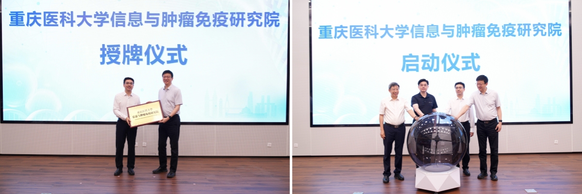 致辞环节后,重庆市教委江鹏副主任为安博平台信息与肿瘤免疫研究院授牌,方方副校长、江鹏副主任、覃正杰书记、张泽民校长共同参与启动仪式。