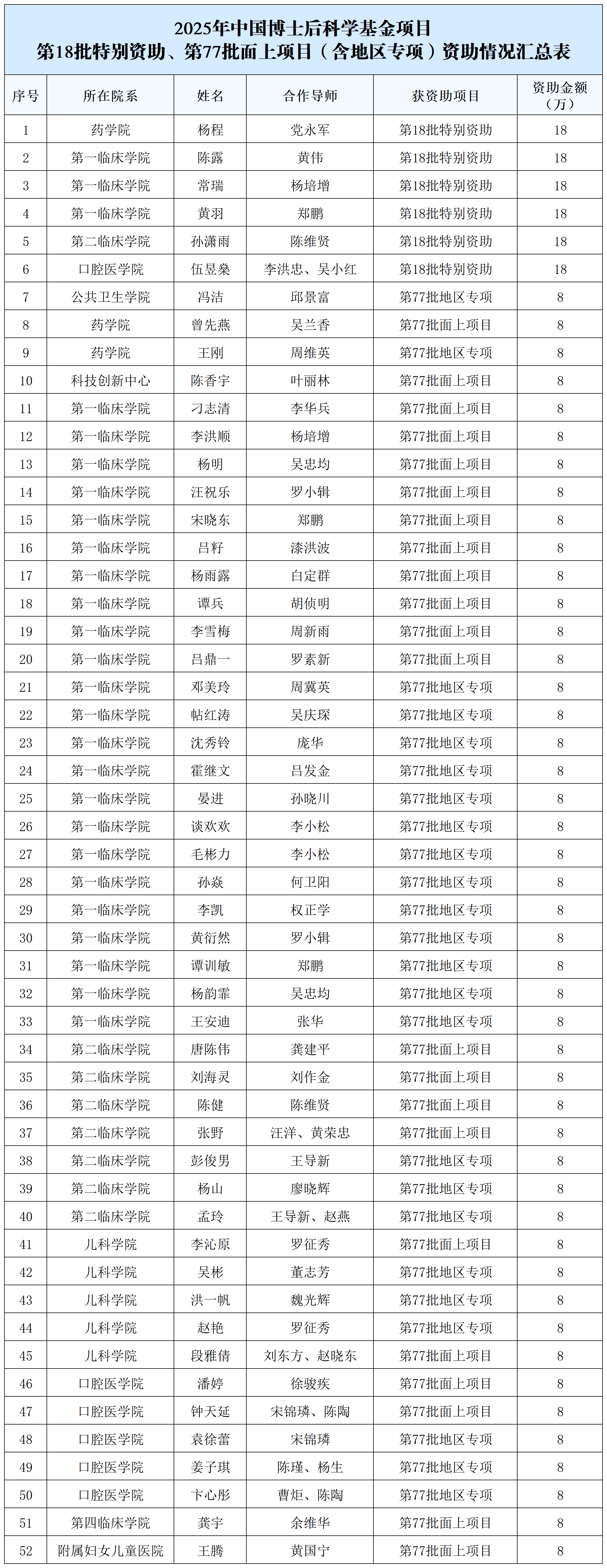 近日,中国博士后科学基金会发布了第18批中国博士后科学基金特别资助、第77批中国博士后科学基金面上项目(含地区专项)获资助人员名单。我校杨程等6名博士后获得第18批中国博士后科学基金特别资助,冯洁等46名博士后获得第77批面上项目(含地区专项)。