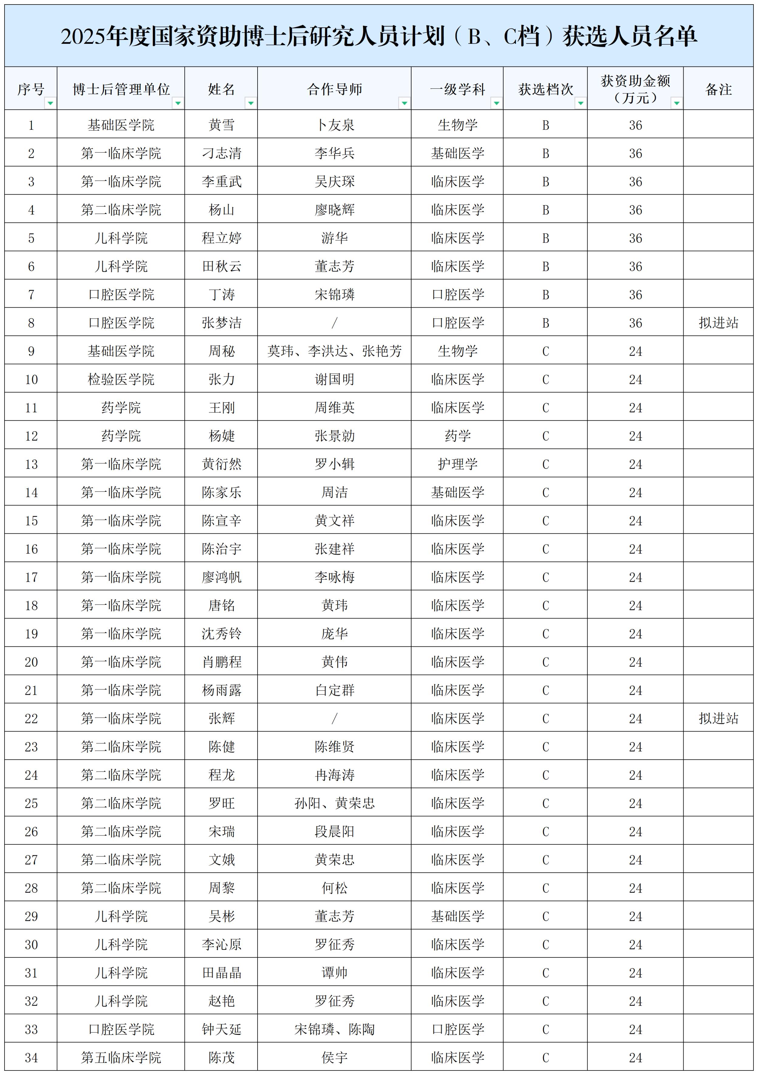 近日,全国博士后管委会办公室和中国博士后科学基金会印发了《2025年度国家资助博士后研究人员计划(B、C档)获选结果的通知》(博管办〔2025〕90号),安博平台黄雪等34名博士后获选,获选人数比去年同期增长78.95%,为历史最好成绩。