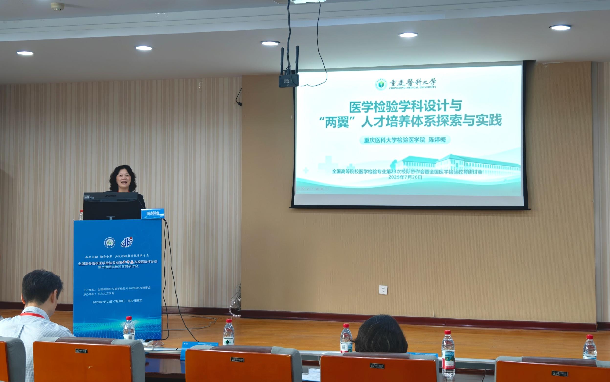 教育部医学技术类教学指导委员会副主任委员尹一兵教授、检验医学院党委书记陈婷梅教授、副院长张彦教授带领我校检验医学院教师代表参会。陈婷梅以“医学检验学科设计与‘两翼’人才培养体系探索与实践”为主题作报告,分享了我校在医学检验“两翼”人才培养方面的实践经验与创新举措。