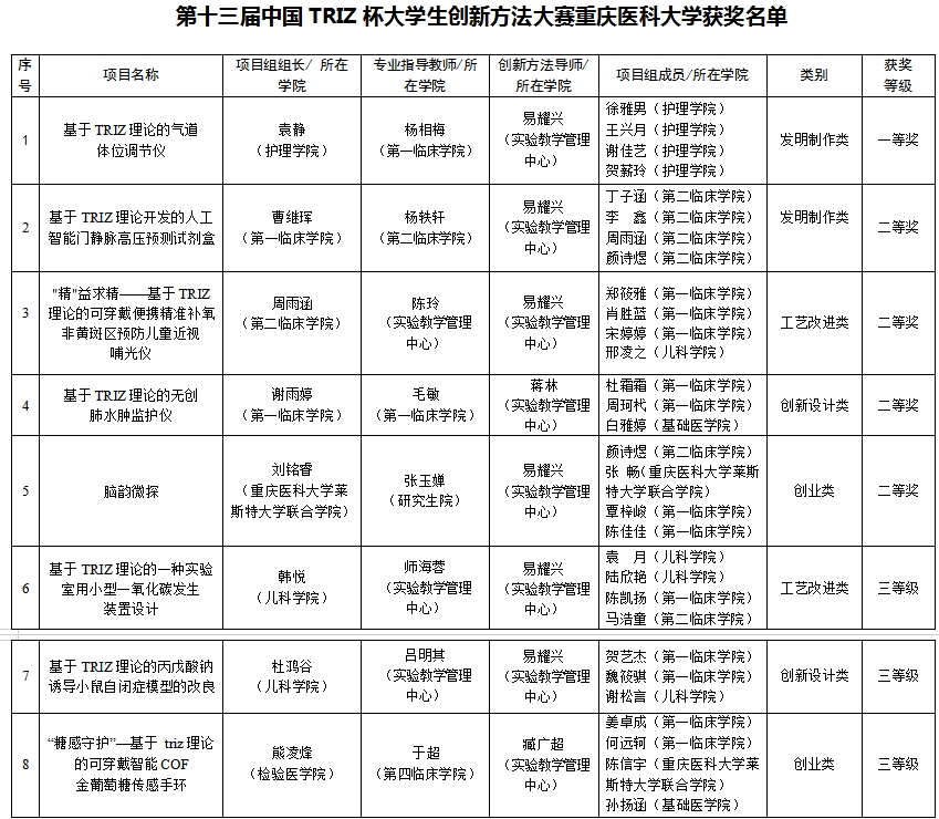 我校基于“安博平台-市级-国家级”三级大学生创新创业训练计划,深度融入TRIZ理论,鼓励学生运用TRIZ解决临床实际问题。依托生物医学创新创业实践基地,配备“TRIZ导师+专业导师”的双导师团队,搭建师生对接平台,通过TRIZ理论培训和项目打磨筛选出优质医学创新项目。在前期校赛阶段共有30个团队成功报名,经决赛答辩25个团队脱颖而出,推荐进入市赛;在重庆市比赛中,我校共获得特等奖2项、一等奖5项、1项二等奖,三等奖7项,位居市内高校前列。其中获得二等奖以上的8个项目获推进入国赛,经国赛决赛网评,3项获评为三等奖,5项进入现场总决赛争夺一、二等奖。在现场总决赛的赛场上,我校5支团队的代表讲解自信流畅,答辩沉着冷静,充分展示了我校学子的双创风采和“TRIZ+医学”的融合优势,圆满完成总决赛比赛任务,取得优异成绩。