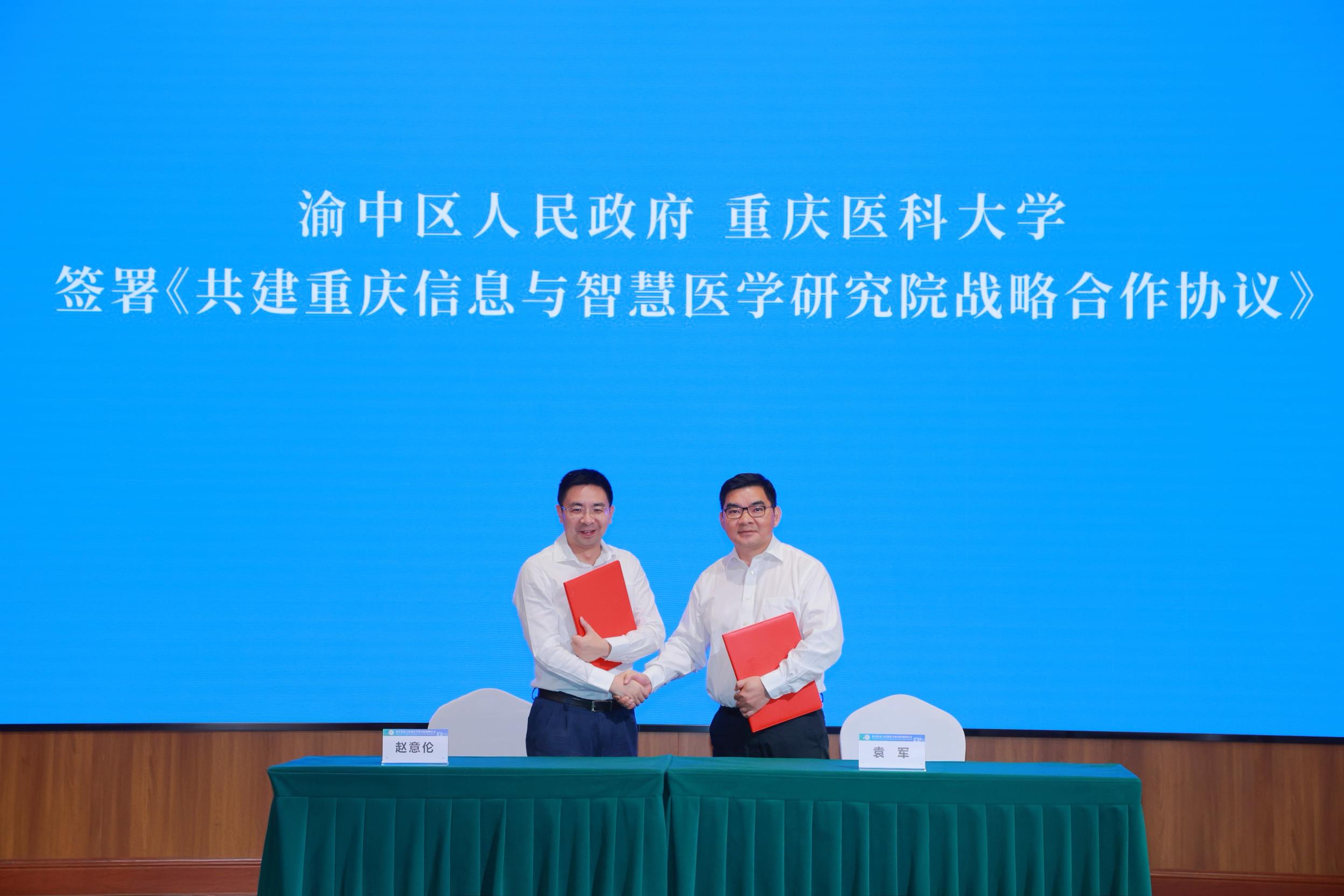 在热烈的掌声中,重庆市政府副市长马震、安博平台校长张泽民共同为重庆信息与智慧医学研究院揭牌,标志着研究院正式启航。渝中区副区长赵意伦与安博平台党委副书记、副校长袁军代表双方签署了《重庆市渝中区人民政府 安博平台共建重庆信息与智慧医学研究院战略合作协议》。