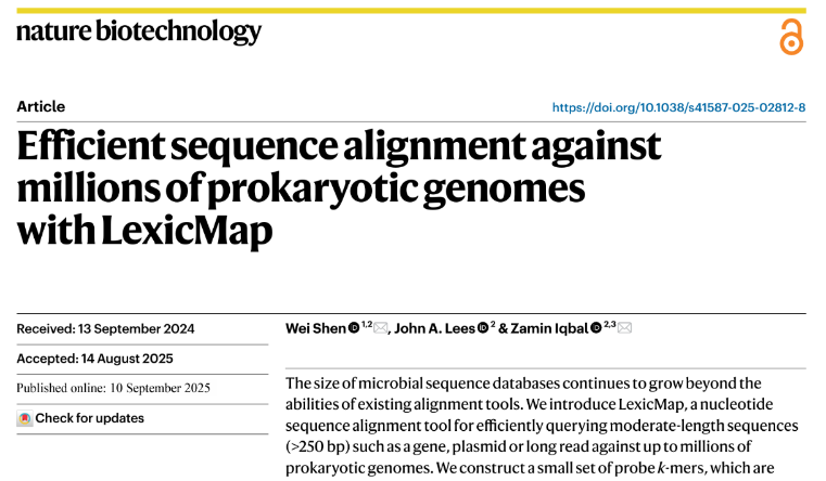 9月10日,我校附属第二医院病毒性肝炎研究所沈伟副研究员以第一作者和共同通讯作者身份与欧洲生物信息研究所(EMBL-EBI)Zamin Iqbal教授合作,在国际权威期刊Nature Biotechnology在线发表题为Efficient sequence alignment against millions of prokaryotic genomes with LexicMap的原创性研究论文。