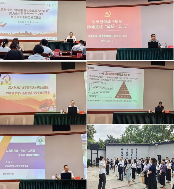 此次培训课程丰富、特点鲜明。内容上注重理论与实践相结合,既涵盖党的创新理论、党性教育等“必修课”,也聚焦党支部标准化规范化建设、高校党建“双创”等“实操课”。师资上注重校内与校外联动,袁军,市教委组织干部处副处长姚文平,市委党校、西南大学的专家学者先后作专题辅导。方式上注重多种教学形式相结合,采用“集体学习+个人自学”“线下授课+线上拓展”“专题研讨+现场教学”的多元化模式,提升了培训的针对性、实效性。