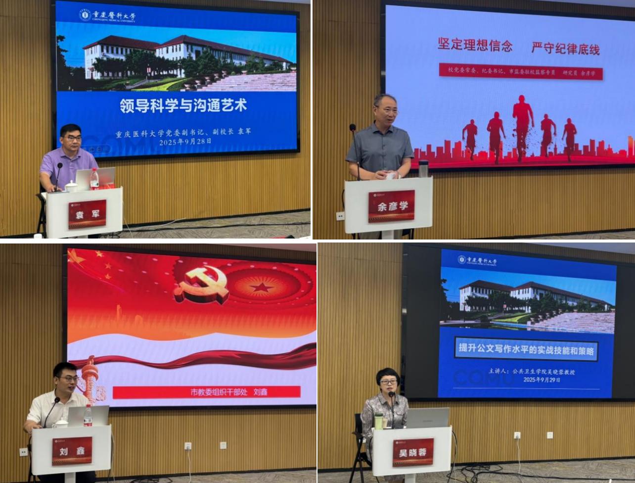 本次培训坚持组织需求、岗位需求和干部需求相统一,课程设置丰富多样,涵盖党的创新理论、党性教育和履职能力培训等多个方面。袁军,党委常委、纪委书记,市监委驻安博平台监察专员余彦学等校领导,围绕领导科学与沟通艺术、强信念守底线等内容作专题辅导,市教委组干处处长刘鑫作干部管理监督政策辅导,公共卫生学院教授吴晓蓉讲授提升公文写作水平的实战技能和策略。本次培训还安排了“西迁精神”现场教学、分组学习研讨,旨在推动理论与实践深度融合,切实提升干部政德素质和履职能力。