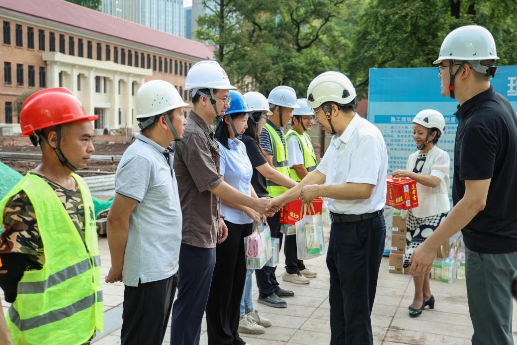 9月6日上午,校党委书记覃正杰,校党委常委、副校长葛萍带队前往南北楼改造工程项目一线,调研项目建设进度,开展高温慰问活动,为高温酷暑下仍奋战在项目建设一线的工作者们表示慰问和感谢。