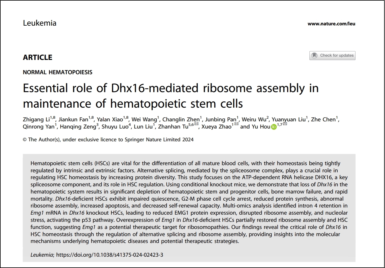 近日,我校基础医学院侯宇教授团队联合基础医学院赵雪雅副教授、莱斯特大学涂占晗教授在国际知名期刊Leukemia杂志发表了题为“Essential role of Dhx16-mediated ribosome assembly in maintenance of hematopoietic stem cells”的研究论文。