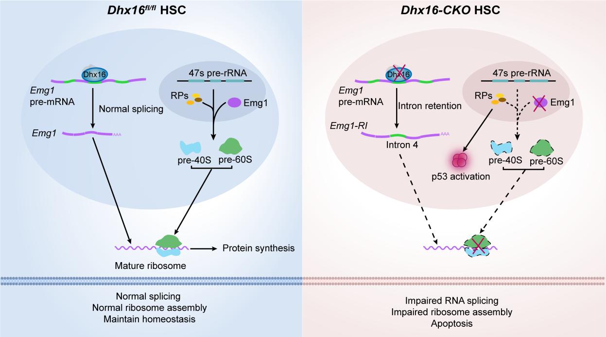 造血干细胞(Hematopoietic Stem Cells, HSCs)对维持机体终身造血至关重要,其稳态受到内在和外在因素的严格调控。剪接体复合物介导的可变剪接通过增加转录本多样性及其后续的蛋白质多样性在调控HSCs稳态中发挥了重要作用,但其机制尚不清楚。本研究聚焦于剪接体的关键组分DHX16,探讨了其在HSCs稳态维持中的作用机制。研究发现HSCs中Dhx16通过维持Emg1前体mRNA的正常可变剪接,维持EMG1蛋白表达,确保核糖体的正确组装,抑制了p53信号通路的激活及细胞凋亡,维持HSCs稳态。这些发现不仅揭示了Dhx16通过调控可变剪接和核糖体组装在HSCs稳态维持中的关键作用,也为理解骨髓衰竭性疾病的分子机制及潜在治疗策略提供了新的见解。