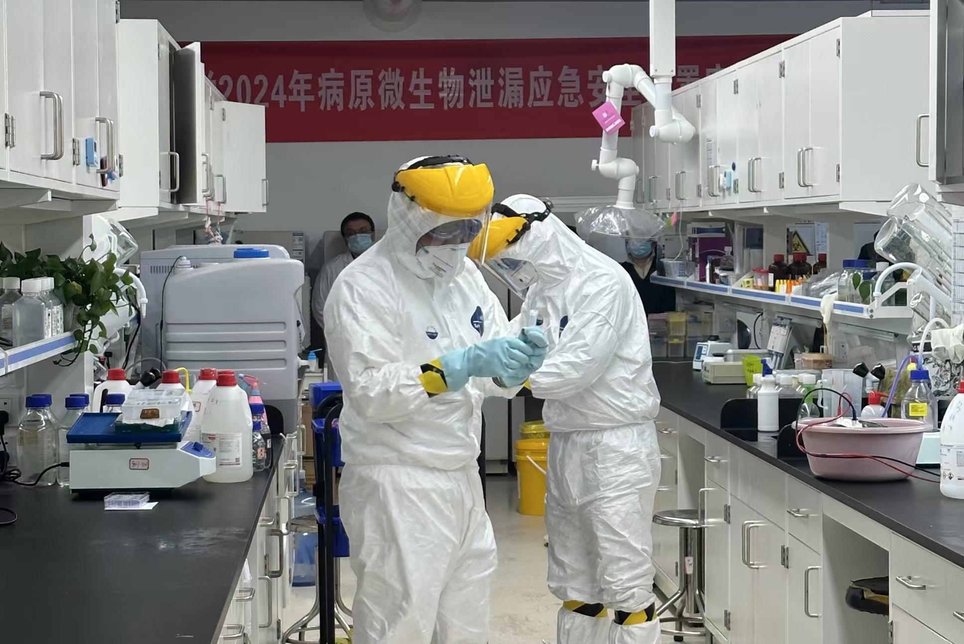 应急演练环节在崇医楼807实验室进行。通过模拟实验人员在转移病毒培养物的器皿时,不慎摔碎培养皿,污染实验室地面的场景,开展应急消毒、人员撤离、隔离、警戒、事故报告、封闭实验、事故实验室消毒、恢复实验等应急处置。通过专业指导、参演师生示范,观摩人员详细学习了生物安全防护意识及应对突发事件的正确处置流程。