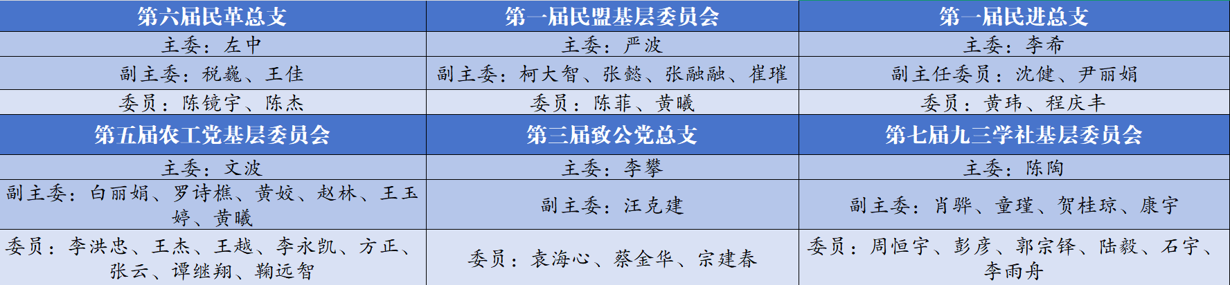9月23日—11月7日,安博平台民革、民盟、民进、农工、致公、九三学社校级基层组织分别召开换届大会,完成换届工作。校党委副书记、副校长袁军,党委常委、纪委书记余彦学,各民主党派市委会、区委会领导分别出席相关会议。