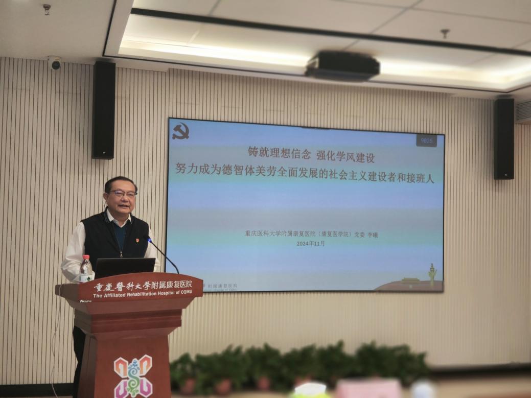 11月14日下午,附属康复医学院在大渡口院区8楼会议室举办了2024-2025学年第1学期第2期院系讲座。本次讲座以“铸就理想信念 强化学风建设,努力成为德智体美劳全面发展的社会主义建设者和接班人”为主题,由附属康复医院(康复医学院)党委书记李曦主讲,科教科科长张宏英主持,学院全体研究生和实习学生共30余人参加了此次讲座。