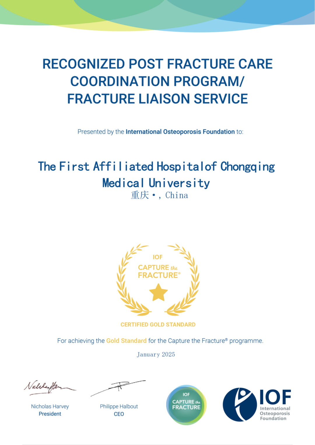 近日,附属第一医院骨科荣获国际骨质疏松基金会(IOF)国际骨折联络服务(FLS)最佳实践金奖。该奖项是国际骨质疏松管理领域内的最高荣誉之一。全国仅有18家医院获此奖项,附属第一医院为重庆市唯一一家获此荣誉的医院。