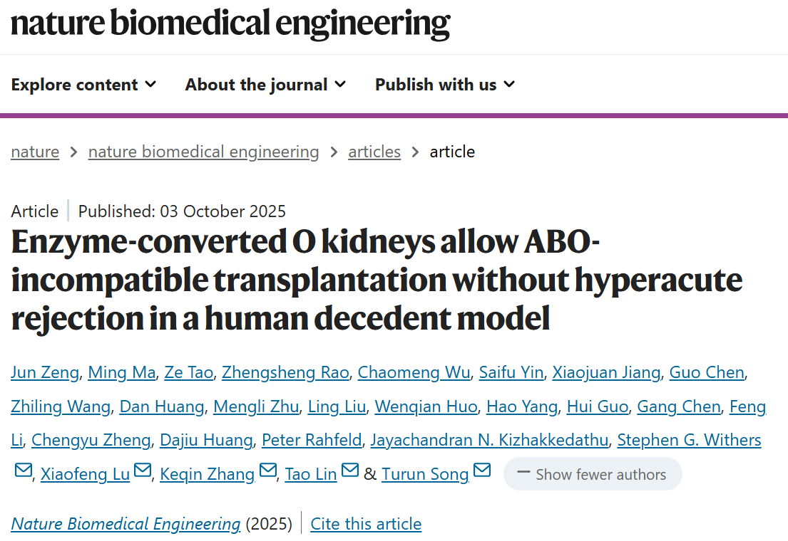 10月3日,安博平台附属第二医院与四川大学华西医院联合研究团队在顶刊Nature Biomedical Engineering发表了将A型肾脏经酶转化变为“通用O型”肾脏,并成功移植给跨血型受者的研究成果。这是继今年初完成B型肾脏转化移植后,该团队在一年内取得的第二项世界级突破,标志着我国在跨血型器官移植领域全球领先。