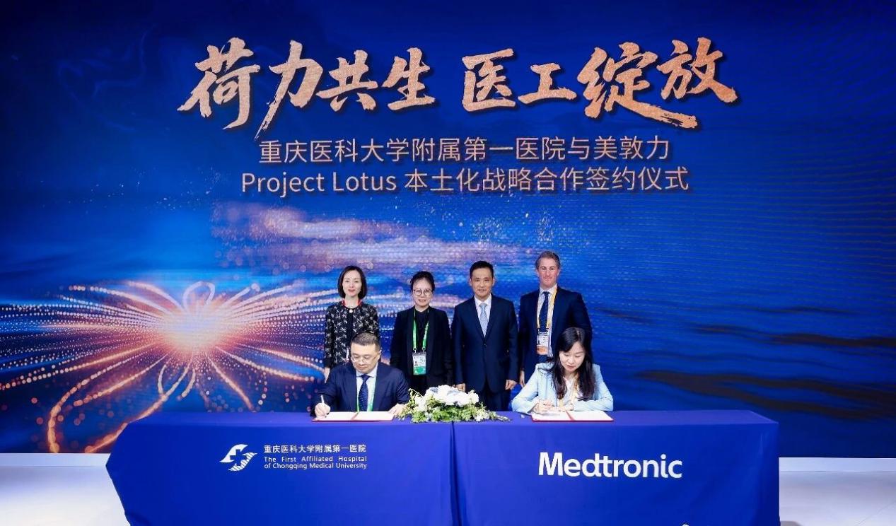 11月6日,在上海举行第八届中国国际进口博览会期间,附属第一医院与全球知名医疗科技企业美敦力签署战略合作协议,正式启动基于医院原创专利技术的胸主动脉产品(LOTUS)全球研发计划。重庆市商务委员会党组成员、副主任唐卫东,重庆市卫生健康委员会二级巡视员谢春鹰,附属第一医院党委委员、副院长白定群,美敦力结构性心脏病业务副总裁兼全球总经理Jorie Soskin,美敦力中国区结构性心脏病、主动脉及周围血管健康业务副总裁黄芳等出席签约仪式。