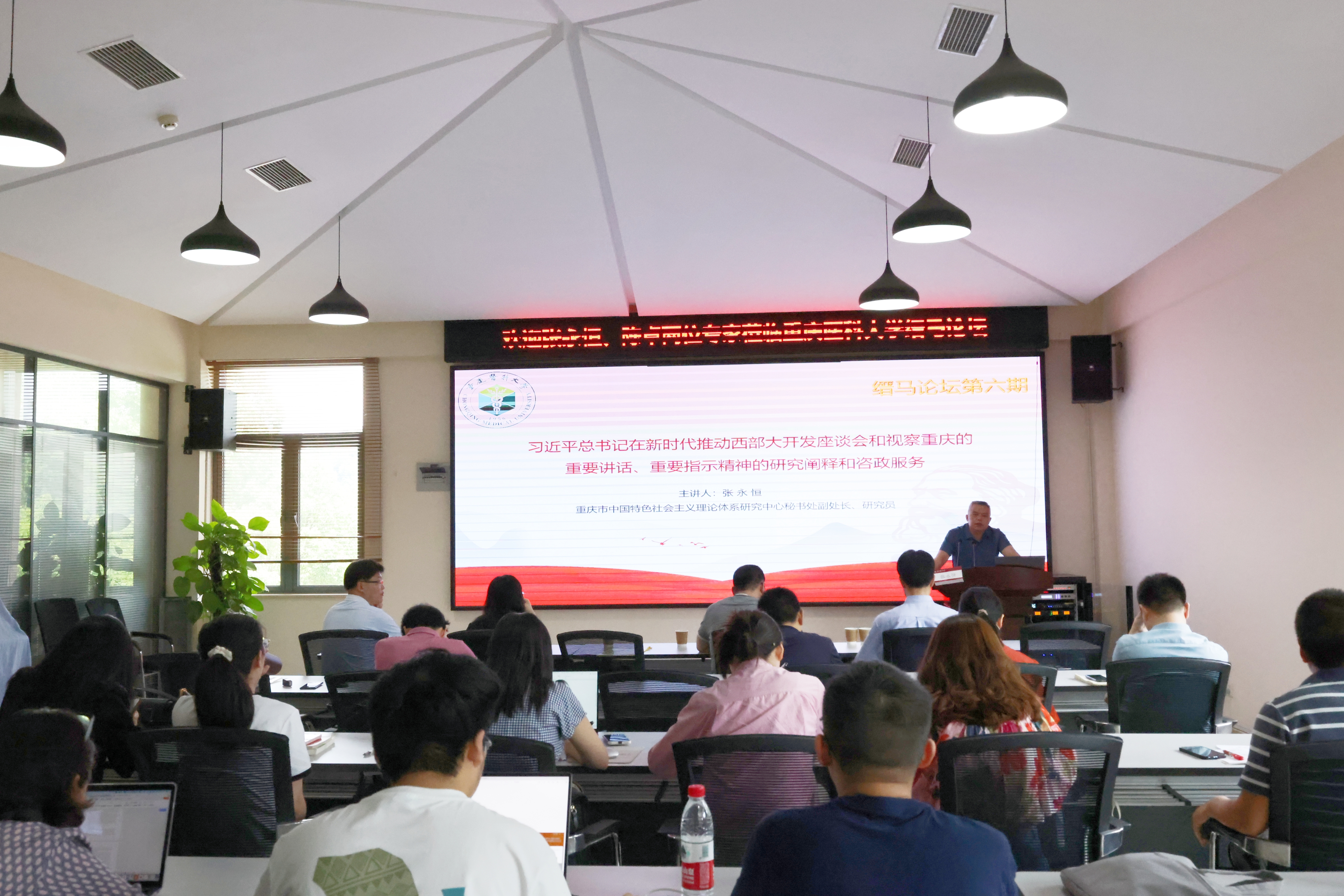 张永恒作题为“习近平总书记在新时代推动西部大开发座谈会和视察重庆的重要讲话、重要指示精神的研究阐释和咨政服务”专题讲座。他围绕习近平总书记在新时代推动西部大开发座谈会和视察重庆的重要讲话重要指示精神的丰富内涵、精髓要义及贯彻落实三个方面展开深刻论述,指明作为新时代哲学社会科学工作者特别是高校教师所应肩负的职责使命与奋进方向。他结合自身从事咨政研究的经历与体会,详尽解析了相关选题类型结构,并介绍了党的创新理论宣传阐释文章追加立项和全市哲学社会科学创新工程申报等具体情况。