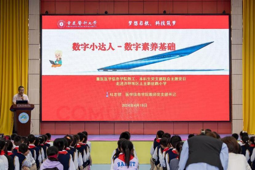 为帮助小学生提升数字素养,更好地适应数字化生活和学习,4月19日下午,医学信息学院本科生党支部联合教师党支部走进重庆市沙坪坝区新丝路小学,开展“梦想启航、科技筑梦”数字科普活动。新丝路小学党支部书记、校长骆永,副校长柯发玲,小学生代表和学院教师党支部书记、卫生信息管理与决策教研室副教授杜志银,本科生党支部书记、学生工作办公室主任王丽君,师生党员、志愿者等共同参加了活动。