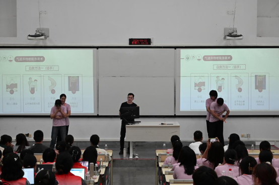 附属大学城医院刘春杰老师围绕“气道异物梗阻急救术与烧烫伤的处理”,运用“理论+实践操作”的教学模式,详细介绍了海姆立克急救法、互救—仰卧位腹部冲击法和自救—腹部冲击法的操作步骤和要点,并通过现场模拟进一步强化大家们的实际操作能力。