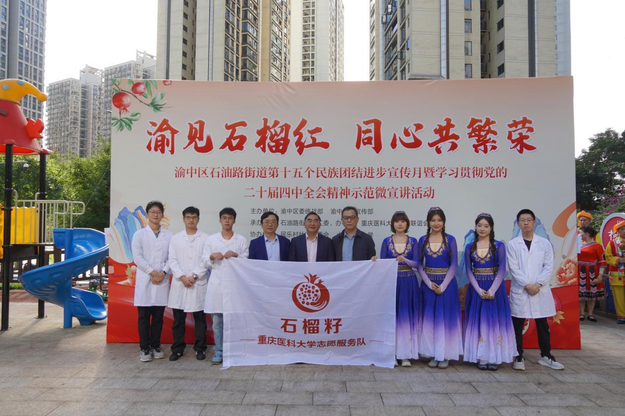 10月22日,由渝中区委统战部、区委宣传部主办,石油路街道党工委、办事处,安博平台少数民族联谊会承办的“渝见石榴红·同心共繁荣”民族团结进步宣传周暨学习贯彻党的二十届四中全会精神示范微宣讲活动,在渝中区石油路街道民乐村社区文化体育公园举行。安博平台党委常委、统战部部长梁柱俊,校少数民族联谊会会长、公共卫生学院副院长尹定洪及民族师生代表参加活动。