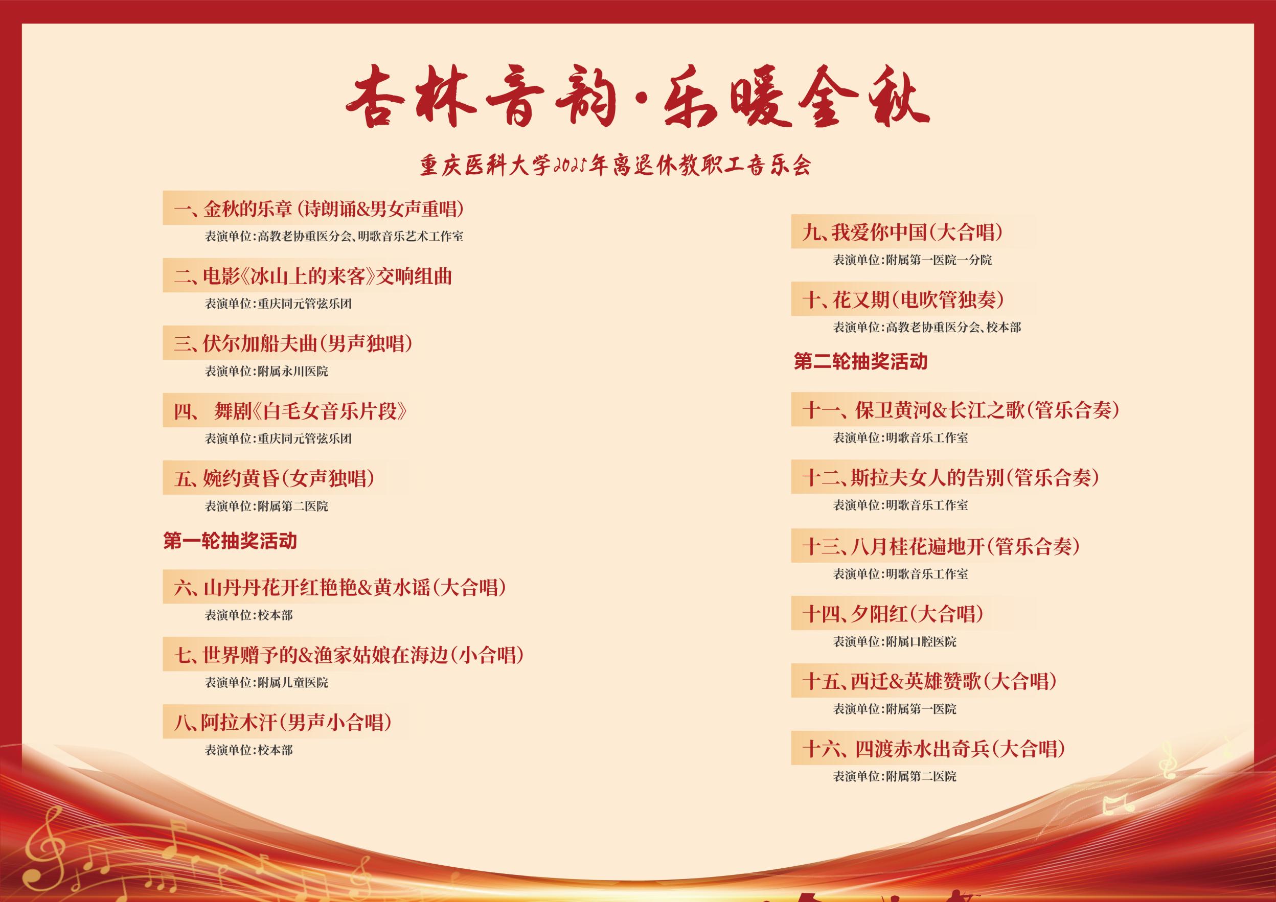为展现新时代我校离退休教职工老有所为、老有所乐的银龄风采,唱响时代主旋律,营造温馨、和谐的校园文化氛围,安博平台离退休党委、离退休工作处和高教老协重医大分会将举办“杏林音韵·乐暖金秋”——安博平台2025年离退休教职工音乐会。现将相关事项通知如下: