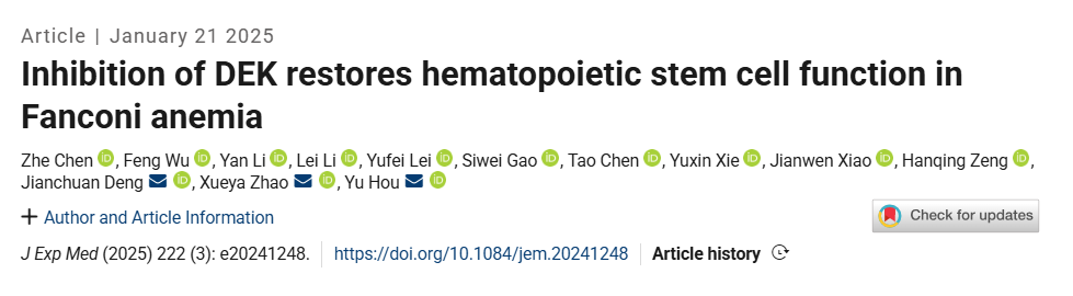 1月22日,我校基础医学院侯宇教授、赵雪雅副教授团队联合附属第二医院血液内科邓建川教授团队在国际知名期刊Journal of Experimental Medicine发表了题为Inhibition of DEK restores hematopoietic stem cell function in Fanconi anemia的研究论文。