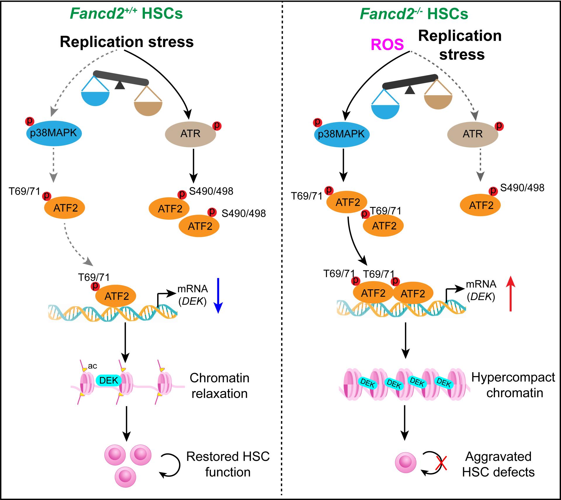 在本研究中,研究人员利用多组学技术(RNA-seq,ATAC-seq及CUT&Tag-seq)绘制了复制压力下HSCs的响应图谱,首次发现HSCs在复制压力下适应性出现H3K27ac修饰及染色质可及性增加现象。相反限制染色质的松弛会阻碍复制压力的消减,更会直接引起复制压力,进而损害HSCs的维持及造血功能。研究人员发现FA患者中骨髓CD34+细胞染色质可及性较正常样本显著降低,揭示了FA患者造血干祖细胞中复制压力消减受阻的表观机制。进一步的机制研究发现染色质架构蛋白DEK是关键效应因子,其是限制H3K27ac修饰及染色质可及性的关键蛋白。复制压力下,野生型小鼠的HSCs通过ATR激酶促进转录因子ATF2的S490/498位点磷酸化,造成ATF2与DEK基因启动子区域结合减少,进而抑制DEK基因转录,最终促进染色质松弛;相反范可尼贫血模型小鼠(Fancd2敲除小鼠,Fancd2-/-)的HSCs因p38激酶过度激活,促进ATF2的T69/71位点磷酸化,维持高转录活性,导致DEK异常高表达,进而阻碍染色质松弛 并加剧复制压力。此外研究人员证实FA患者骨髓CD34+细胞中DEK异常高表达,敲低DEK或者利用DEK抑制剂(核酸适配体DTA-64)处理都能有效促进FA患者来源的CD34+细胞在体造血功能增强。这些发现为解释FA中HSCs功能缺陷提供了新见解,更为干预FA提供了新靶点。
