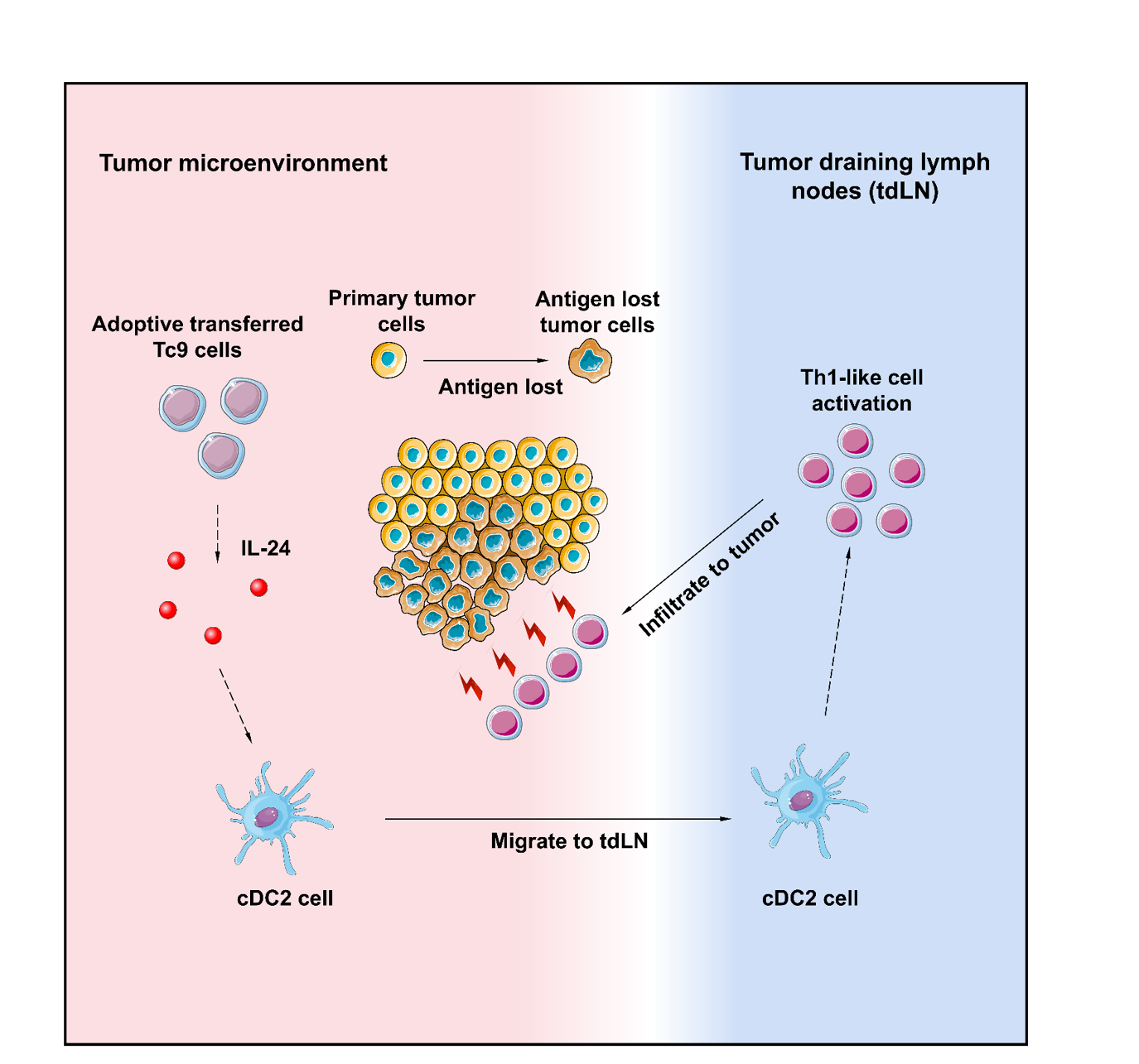 基于以上结论,研究人员继续深入探索,发现Tc9细胞是通过重塑宿主CD4+T细胞应答来实现长效抗肿瘤作用的,即重塑宿主CD4+T细胞为Th1样效应细胞,诱导针对肿瘤新抗原的寡克隆扩增与细胞毒性应答以实现对ALV的长效控制。为了研究Tc9细胞在体内诱导宿主CD4+T细胞应答的机制,研究人员通过免疫荧光染色、流式分析等技术手段,发现Tc9细胞通过招募cDC2细胞并依赖CCR7信号引导其迁移至tdLN,激活宿主CD4+T细胞分化为Th1样效应细胞,进而通过新抗原特异性应答实现对ALV的长效控制。至此,cDC2-CD4+T细胞轴在Tc9疗法中的核心地位已被证实。那么CD4+T细胞与cDC2又是通过怎样的机制相互联结和发挥作用的呢?实验表明,Tc9细胞能够通过分泌IL-24来驱动cDC2迁移与宿主CD4+T细胞活化,这一机制也揭示了IL-24在连接Tc9细胞与cDC2介导的先天性免疫及CD4+T细胞介导适应性免疫中的桥梁作用。