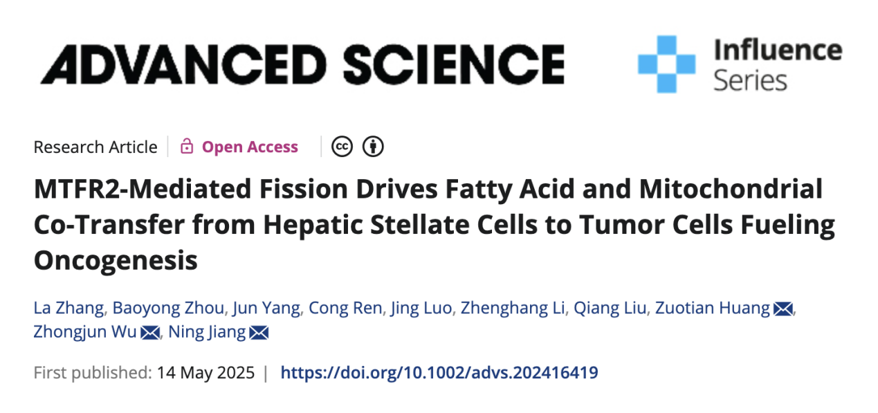 近日,基础医学院蒋宁联合附属第一医院黄佐天及吴忠均教授在Advanced Science杂志发表题为MTFR2-Mediated Fission Drives Fatty Acid and Mitochondrial Co-Transfer from Hepatic Stellate Cells to Tumor Cells Fueling Oncogenesis,以揭示脂肪酸与线粒体从肝星状细胞共转移至癌细胞,推动肝癌的进展。