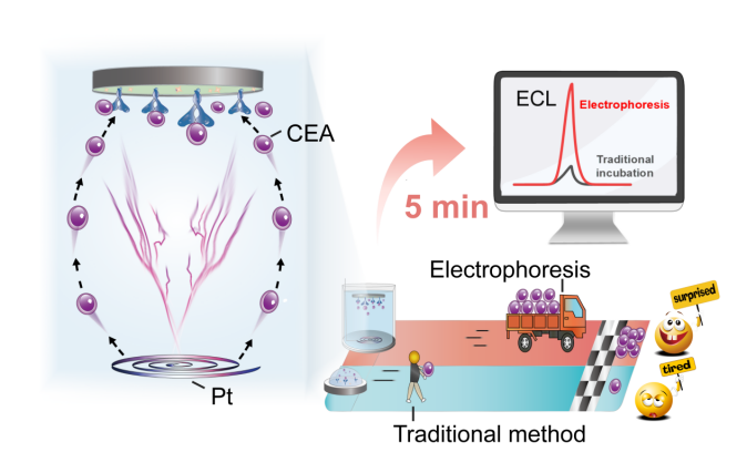 电化学发光(ECL)免疫传感是临床生物标志物高灵敏检测关键技术。本研究针对ECL免疫传感器存在的蛋白孵育耗时长、检测效率低下的问题,开创性提出电场力驱动蛋白分子定向富集机制。通过构建电泳耦合ECL系统,利用癌胚抗原(CEA)在特定缓冲环境中的负电特性,施加定向电场使目标分子如同搭上“定向快车”,能被精准迅速迁移至工作电极表面,革新传统被动扩散模式。该技术将关键抗原孵育时间大幅缩短至5分钟,极大提升检测效率。