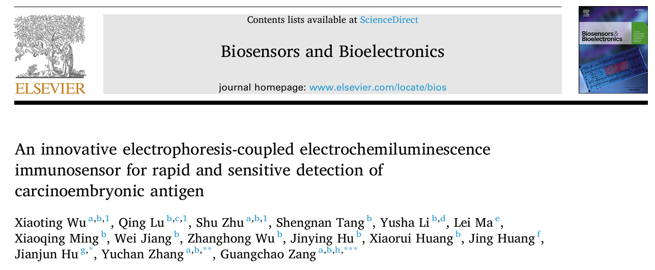 近日,我校基础医学院学生武晓婷(2020级基础医学)、鲁清(2019级医学实验技术)在生物医学创新创业实践基地朱姝、张玉婵、臧广超老师团队的指导下,将传统电泳技术与电致化学发光技术结合,建立了电泳耦合电化学发光免疫传感分析新方法,用于临床蛋白质的快速灵敏检测。该研究成果发表于生物传感领域期刊Biosensors and Bioelectronics,论文题目为An innovative electrophoresis-coupled electrochemiluminescence immunosensor for rapid and sensitive detection of carcinoembryonic antigen。